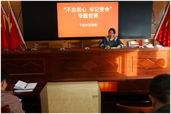 10月29日下午,包掛下淀社區(qū)主題教育活動(dòng)的豐財(cái)街道紀(jì)委書記王興梅同志來社區(qū)進(jìn)行“不忘初心 牢記使命”專題黨課教育,社區(qū)全體黨員和工作人員參加。