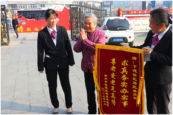 2019年11月5日上午,徐州鼓樓區(qū)我享幸福院院長、工作人員和一名老大媽向徐州下淀社區(qū)黨委書記李普華送來一面上書“求真務實辦實事 尊老愛老見真情”的錦旗,并再三感謝社區(qū)黨委在主題教育活動中求真務實,無償將幸福院門前多年破爛不堪的30余米砂石路全部硬化為水泥路面。