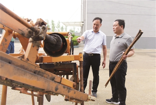 范樓鎮(zhèn)黨委書記張化兵(左一)在查看牛蒡農(nóng)機(jī)。 徐報融媒記者 孫井賢 攝