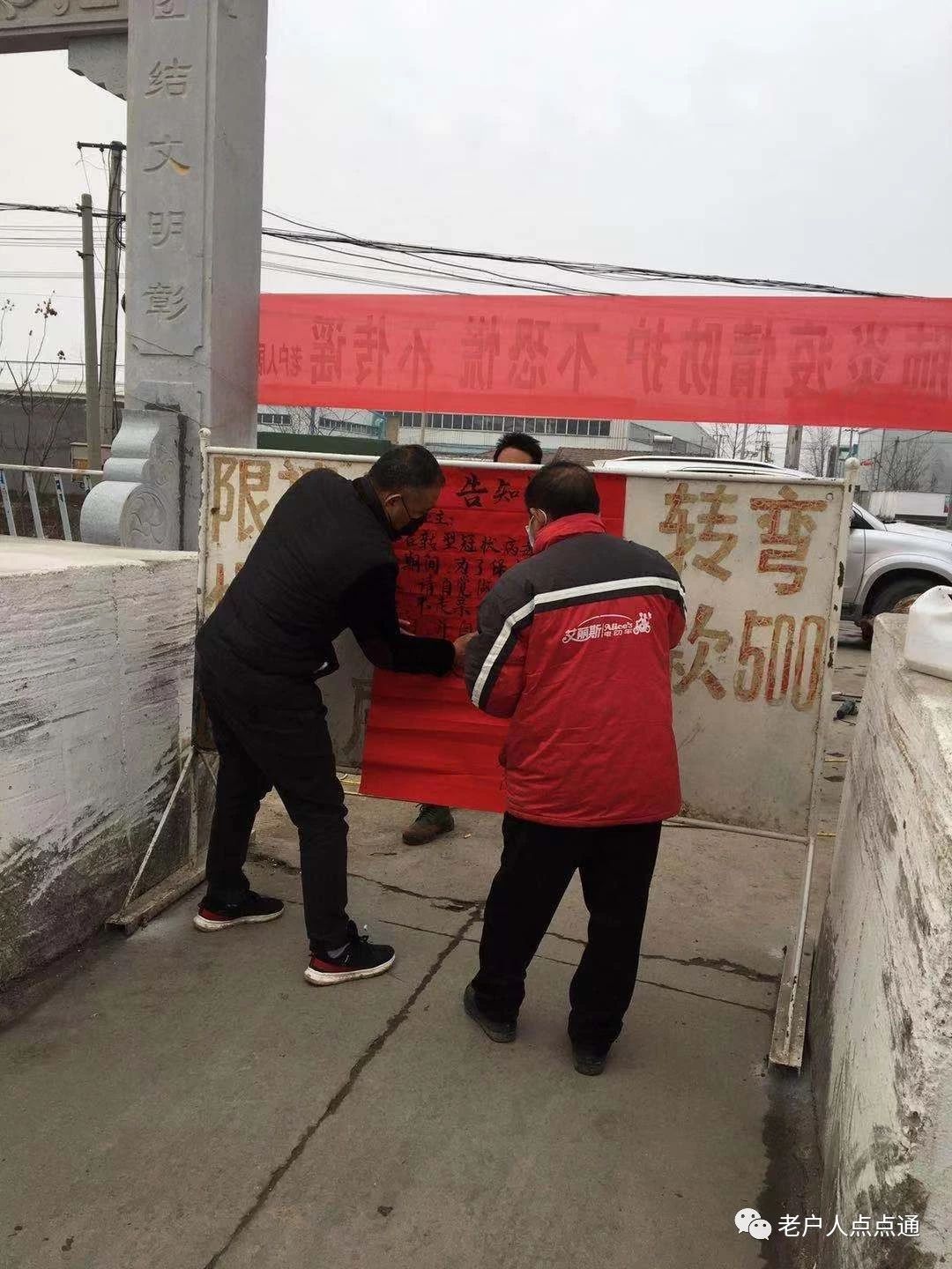 1月27日下午黨員中心戶朱全忠?guī)ьI(lǐng)包掛群眾朱忠芒和朱忠杰深入進(jìn)出社區(qū)主干道北路口防控點(diǎn)張貼告知書,落實(shí)疫情防控工作,并進(jìn)一步加大外來車輛和人員的檢查力度,做好登記,嚴(yán)格把守。