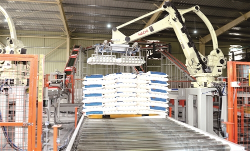 走進(jìn)偌大的智能化生產(chǎn)車間,眼前看不見(jiàn)工人的身影,只有兩只靈活的工業(yè)機(jī)械手在空中上下翻飛。伴隨著機(jī)器低沉的轟鳴聲,機(jī)械手把一袋袋面粉碼放整齊,放入傳送帶,走馬燈似地裝上貨車。