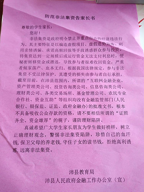 另外,學(xué)校還下發(fā)了防范非法集資告家長書,讓家長們不要相信所謂的證照齊全,資金雄厚的幌子,謹(jǐn)防理財陷阱。
