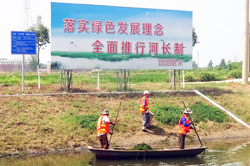 走進具有江蘇省“水美鄉(xiāng)村”之稱的馬寺大溝,河岸一邊立有藍色“河長制”公示牌,上面責任人和監(jiān)督電話一目了然,岸邊的巡河員和船上的保潔員正在例行檢查。