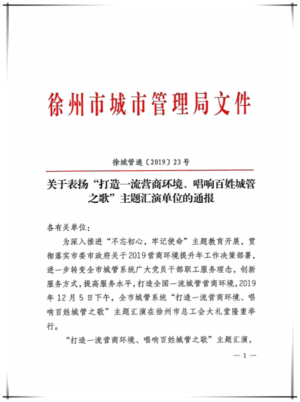 近日,在徐州市總工會(huì)大禮堂舉辦的徐州市城管系統(tǒng)“打造一流營商環(huán)境、唱響百姓城管之歌”主題匯演活動(dòng)中沛縣城市管理局被予以通報(bào)表揚(yáng)。