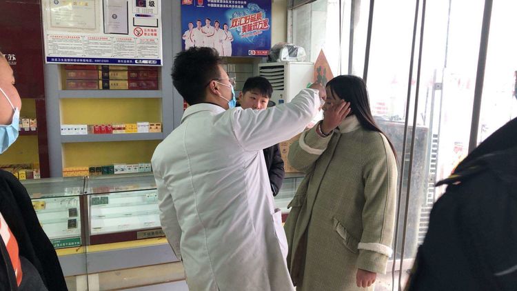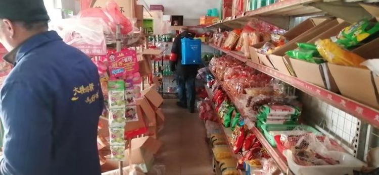 大年初一,志愿者在各購物場所為購物村民測量體溫。