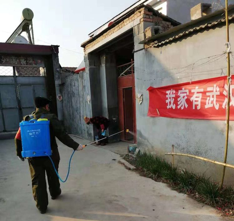志愿者在村莊內外噴灑消毒藥劑。