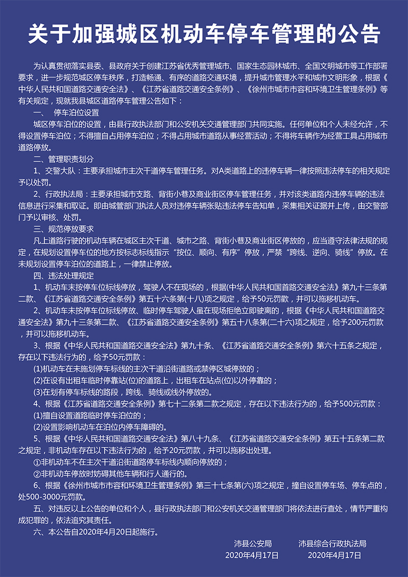 4月29日起,沛縣綜合行政執(zhí)法局、縣公安交通警察大隊(duì)將對(duì)違反停放規(guī)定的機(jī)動(dòng)車(chē)輛進(jìn)行現(xiàn)場(chǎng)拍照,留存違規(guī)證據(jù)后錄入公安交警系統(tǒng),加大處罰力度。