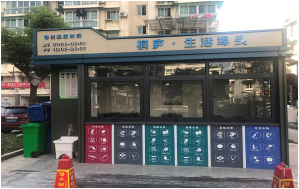 2020年5月6日杭州市桐廬縣城區(qū)內正式實施“二定四分模式”的日子,小區(qū)生活垃圾進行分類精準投放。他們的垃圾分類集中收集房還有個富有當地特色的名字——“桐廬•生活埠頭”。每天在指定時間段內,各個點位的垃圾分類督導員都會準時打開垃圾房的窗戶,接納小區(qū)業(yè)主的生活垃圾。