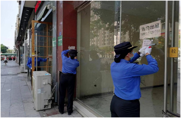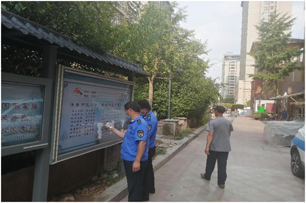 執(zhí)法人員清除張貼在宣傳櫥窗上的“頑癬”