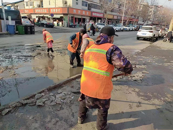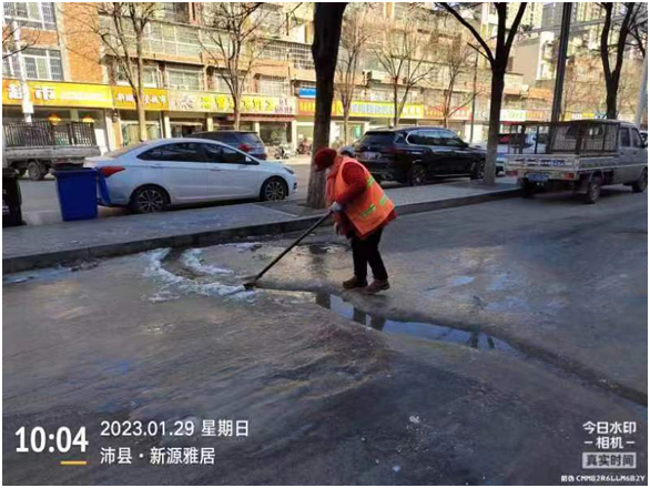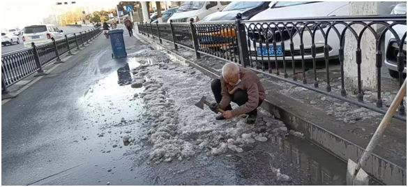環(huán)衛(wèi)所工作人員在巡查中還發(fā)現(xiàn),鼓樓街中醫(yī)院北門東側(cè)下水道及化糞池外溢導(dǎo)致道路結(jié)冰和東風(fēng)中路古沛人家飯店西側(cè)居民樓水管破裂長流水導(dǎo)致道路結(jié)冰的問題。為盡快消除安全隱患保證路面通暢,確保行人正常通行,工作人員在結(jié)冰路面拋撒融雪劑和環(huán)衛(wèi)工人一起進(jìn)行除冰工作,經(jīng)過2個(gè)小時(shí)的努力,路面上近10米堅(jiān)硬濕滑的“冰道”被全部鏟除。