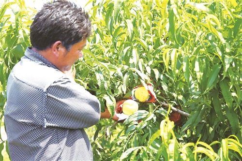 在鐵富鎮(zhèn)連前村集體經(jīng)營的一片桃園里,碩果累累,飄著陣陣誘人的香味。負(fù)責(zé)這塊桃園管理的村民田新廷和鎮(zhèn)村領(lǐng)導(dǎo)一邊查看桃子的生長情況,一邊交流今年桃樹的產(chǎn)果量。