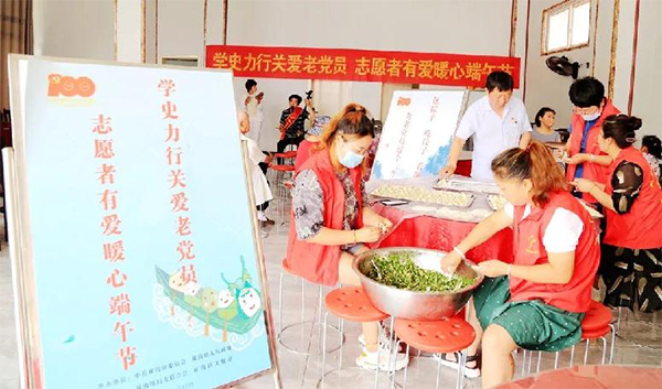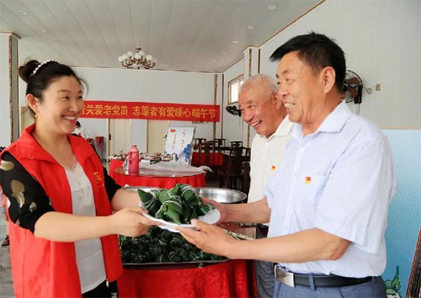 離開時(shí),志愿者們又將一袋袋香氣四溢的“愛心粽”和雞蛋送到老黨員們手中,讓他們把美食帶回家和家人們共度端午節(jié)。