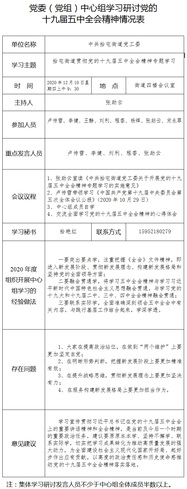 黃淮網(wǎng)  12月10日上午,徐州市銅山區(qū)拾屯街道黨工委理論學(xué)習(xí)中心組貫徹黨的十九屆五中全會精神專題學(xué)習(xí)在街道四樓會議召開,專題學(xué)習(xí)會由街道人大工委副主任張助云主持宣讀了《中共拾屯街道黨工委關(guān)于開展黨的十九屆五中全會精神專題學(xué)習(xí)的實施意見》,街道黨工委書記盧傳雪帶領(lǐng)學(xué)習(xí)《中國共產(chǎn)黨第十九屆中央委員會第五次全體會議公報》(2020年10月29日)。在中心組成員自學(xué)后,大家交流了全面學(xué)習(xí)黨的十九屆五中全會精神的心得體會,街道黨工委書記盧傳雪、黨工委副書記、辦事處主任李健做了強調(diào),其他黨工委成員先后做出發(fā)言。